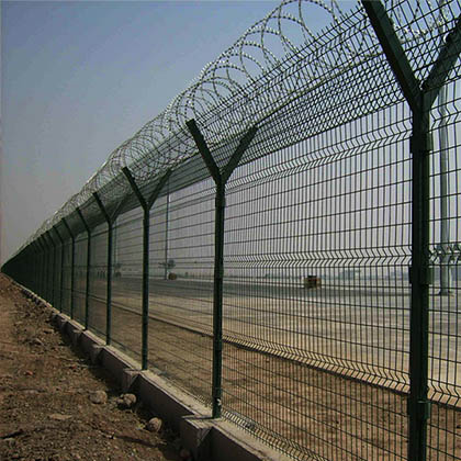 機(jī)場圍網(wǎng) 機(jī)場圍界 機(jī)場護(hù)欄網(wǎng)又叫鋼筋網(wǎng)圍界,主要用V型支架立拄,加強(qiáng)型焊接片網(wǎng),安全防盜連接件和熱鍍鋅刀片刺籠組成強(qiáng)度和安全