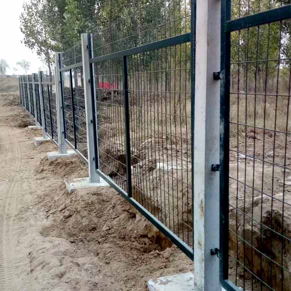 規(guī)格為:網(wǎng)片2760*1797mm或2760*1700mm,網(wǎng)孔75*150mm,絲徑為4.0mm,邊框矩管30*50*2.0mm,連接件方管40*40*2.5mm。防護(hù)柵欄立柱連
