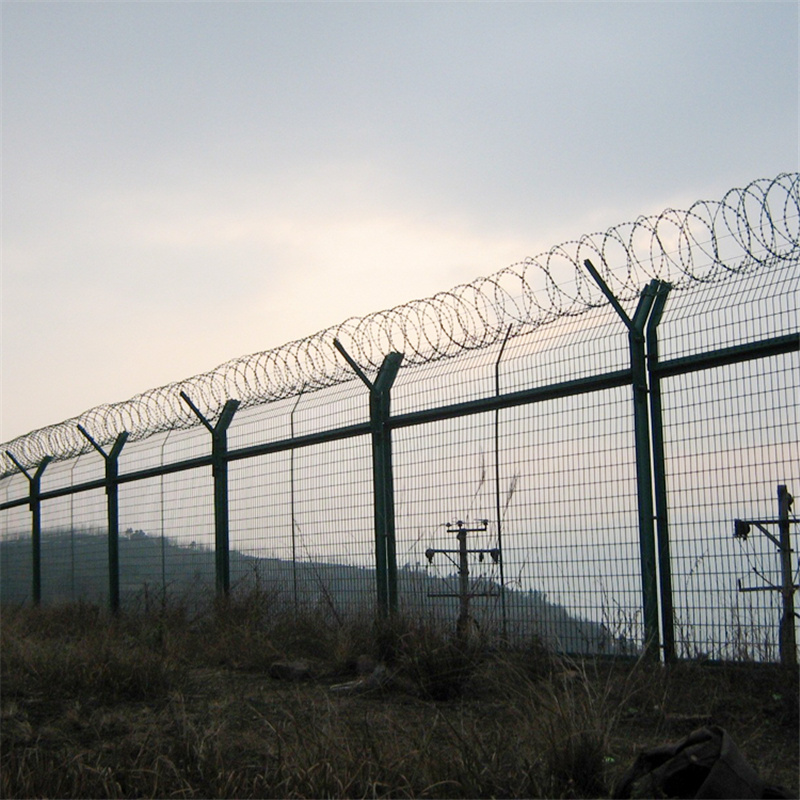 機(jī)場(chǎng)護(hù)欄網(wǎng)又稱(chēng)作“Y型安全防御護(hù)網(wǎng)”,是由V型支架立柱,加強(qiáng)型焊接片網(wǎng),安全防盜連接件和熱鍍鋅刀片刺籠組成強(qiáng)度和安全防御性級(jí)別很高。近年來(lái),被廣泛應(yīng)用在機(jī)場(chǎng),軍事基地等高安全場(chǎng)所。