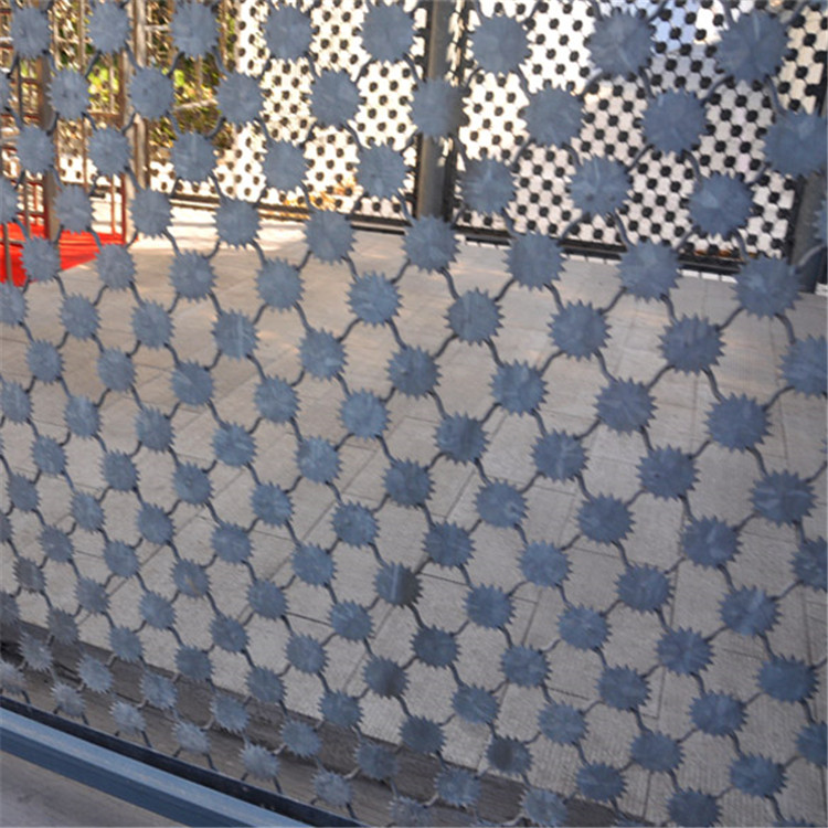 1、梅花刺片:梅花刺片直徑不小于7.5cm(直徑6cm、7cm、8cm),刺片厚1.5mm,采用Q235低碳鋼板沖壓成型。梅花刺片用氬弧焊將梅花形刺片焊接在美格網(wǎng)的節(jié)點上,形成刺形保護(hù),有效的防止了手握腳攀。