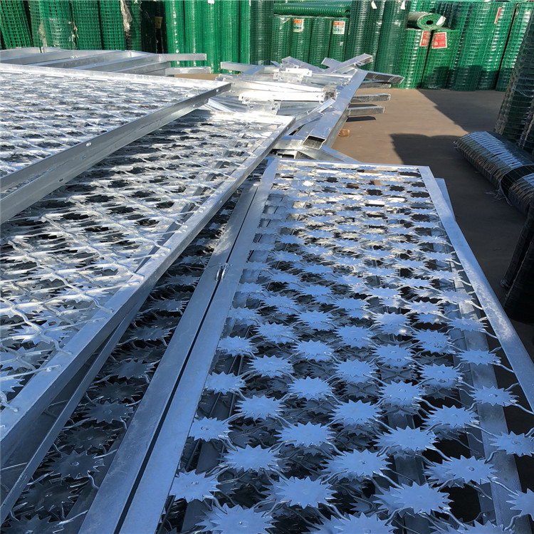 梅花刺防沖監(jiān)獄隔離網(wǎng)為單層梅花刺片網(wǎng),直徑不小于7.5cm,刺片厚1.5mm,采用Q235低碳鋼板沖壓成型。網(wǎng)片為菱形網(wǎng)孔,網(wǎng)格尺寸:120mm*110mm(高*寬),網(wǎng)絲直徑8mm,采用S195線材高壓焊接,每一個(gè)焊點(diǎn)附焊梅花刺一個(gè)。