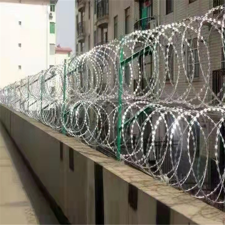 刀刺滾籠安裝方法根據(jù)陡坡地段防護柵欄下檻下部與地面間的間隙采用C25混凝土封閉,寬度180mm,與立柱兩倒平齊,埋入地面以下不小于0.3m.每單元于地面處留移100mm泄水孔.刀刺滾籠安裝方法同樣適用于監(jiān)獄、機場等場地,根據(jù)地形不同適當調(diào)整。