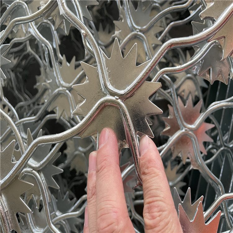 梅花刺隔離網(wǎng)是由V型支架立柱,加強(qiáng)型焊接片網(wǎng),安全防盜連接件和熱鍍鋅刀片刺籠組成強(qiáng)度和安全防護(hù)。地等高安全場(chǎng)所。高碳鋼絲、鍍鋅絲,不銹鋼絲,鋁合金編焊而成;堅(jiān)固、不生銹、美觀大方。