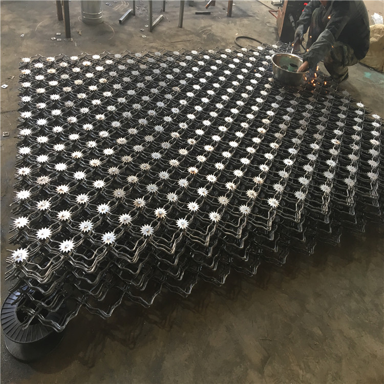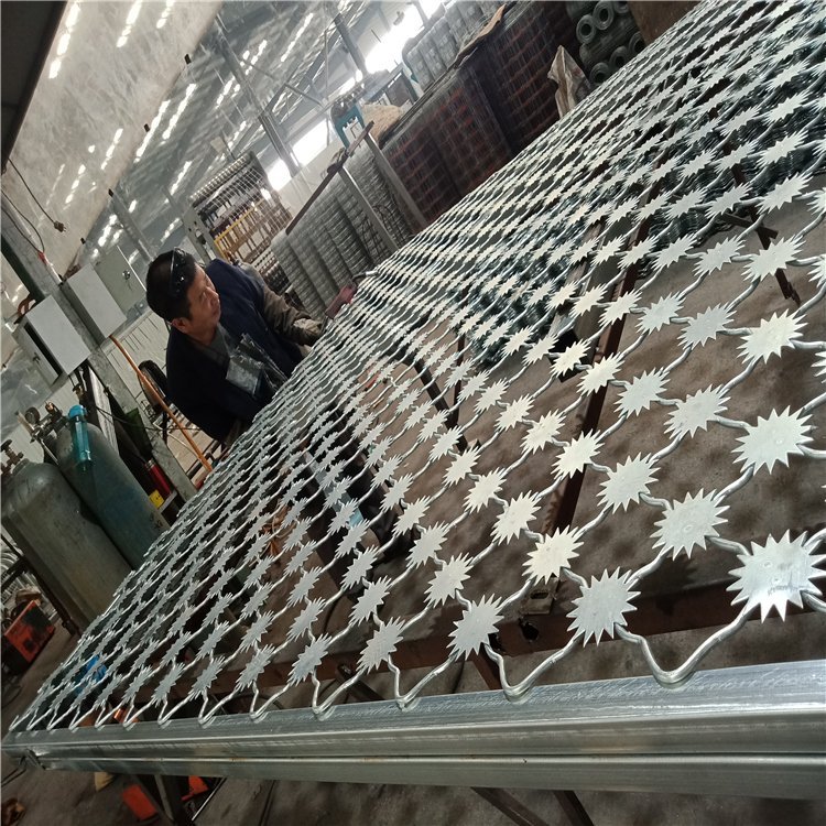 梅花刺片:梅花刺片直徑不小于7.5cm(直徑6cm、7cm、8cm),刺片厚1.5mm,采用Q235低碳鋼板沖壓成型。梅花刺片用氬弧焊將梅花形刺片焊接在美格網(wǎng)的節(jié)點上,形成刺形保護,有效的防止了手握腳攀。