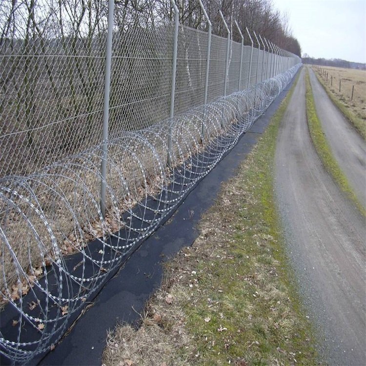 3、鍍鋅刺刀圈材料及安裝技術(shù)要求:鍍鋅刺刀圈材料:常用刀片刺網(wǎng)規(guī)格為BTO-22,刺圈直徑500mm,刀片長度22mm,刀片寬度15mm,刀片間距34mm,鍍鋅噴塑。鍍鋅刺刀圈規(guī)格為雙股2mm鐵絲捻扎而成,刺結(jié)間距102mm,鍍鋅防腐。鍍鋅刺刀圈安裝應控制在每米圍界范圍內(nèi)有5個刺圈,即刺圈安裝間距20Omm,要求刀刺圈間距均勻,上下口平直。刺刀圈固定件為專用卡扣,使用專用工具固定在鋼圍界刺繩上,卡扣不得有松動現(xiàn)象,保證刺網(wǎng)安裝牢固。