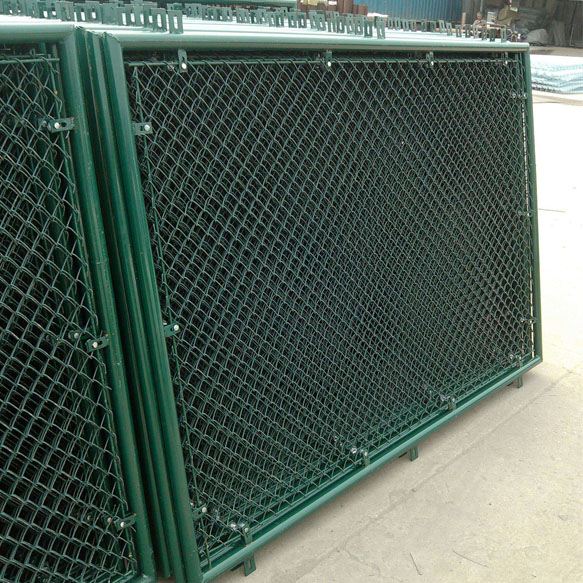 球場(chǎng)圍網(wǎng)由圍網(wǎng)框架+整體式拉網(wǎng)模式,結(jié)構(gòu)簡(jiǎn)單耐用,整體效果好,性價(jià)比高。圍網(wǎng)的骨架通過(guò)直通、三通、四通等專用扣件將立柱和橫梁連成整體呈”口”或”日”字型,用高強(qiáng)度螺栓固定,圍網(wǎng)高度為4000mm,兩立柱間距三米左右;待圍網(wǎng)骨架搭建成型后,現(xiàn)場(chǎng)整體張拉圍網(wǎng),并用扁鐵固定在骨架的立柱及橫梁上?!九鋫?個(gè)1200mm*2000mm的單開式框架門】