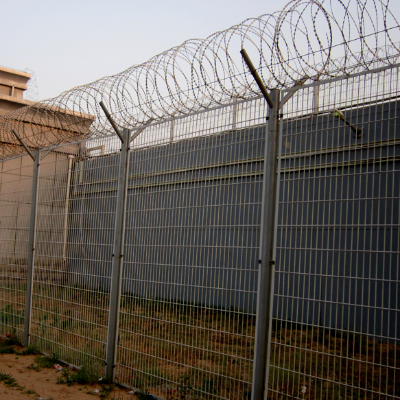 警戒金屬圍墻隔離網(wǎng)又稱作“Y型安全防御護(hù)網(wǎng)”,是由V型支架立柱,加強(qiáng)型焊接片網(wǎng),安全防盜連接件和熱鍍鋅刀片刺籠組成,在強(qiáng)度或安全防御性上的級(jí)別都很高。近年來,被廣泛應(yīng)用在監(jiān)獄,軍事基地等高安全場(chǎng)所。