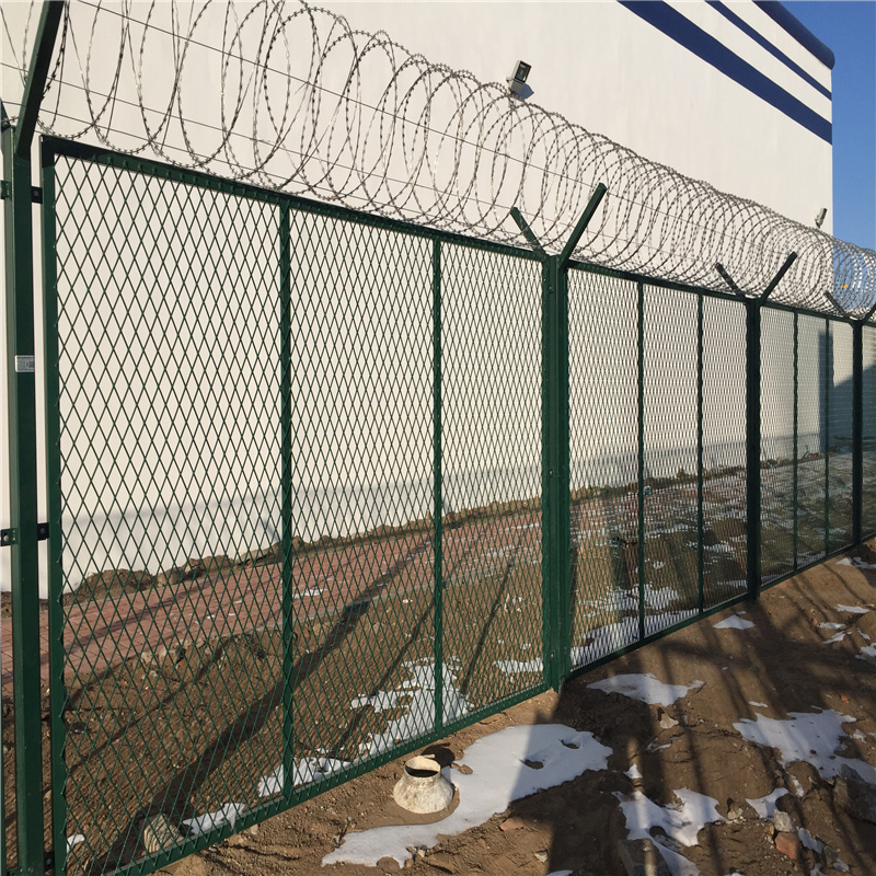 監(jiān)獄安全網(wǎng)圍欄頂部按照要求安裝蛇腹形刀刺網(wǎng),立柱頂部的V型直接兩個側(cè)臂焊接有專用的刺網(wǎng)勾,是每個側(cè)架設(shè)三道熱鍍鋅鋼絲,形成一個V型槽,然后把刀刺網(wǎng)放到上面,再用配套卡扣把鋼絲和刀刺網(wǎng)連接到一起,如果V型架內(nèi)安裝V型網(wǎng)架,安裝就更簡單了,直接把刀刺網(wǎng)連接到V型網(wǎng)上面就可以了。